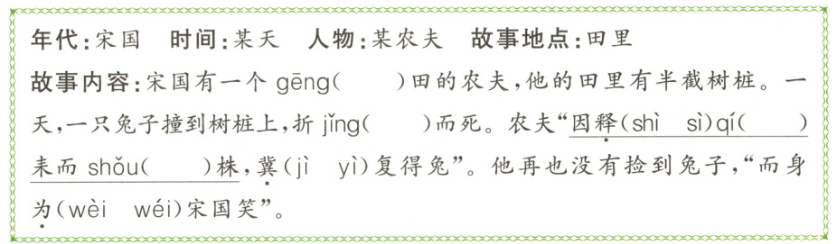 解析:本题考查整体感知的能力。了解了文言文的意思,就可判断出故事的起因是兔子撞在树桩上撞死了(兔走触株,折颈而死)。经过是农夫放下农具,守株待兔(因释其耒而守株,冀复得兔)。结果是他再也没得到过兔子,又被人笑话(兔不可复得,而身为宋国笑)。据此填空即可。