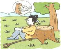 4. 因/释其耒/而守株 于是,这个农夫就放下他手里的农具而守在树桩旁。