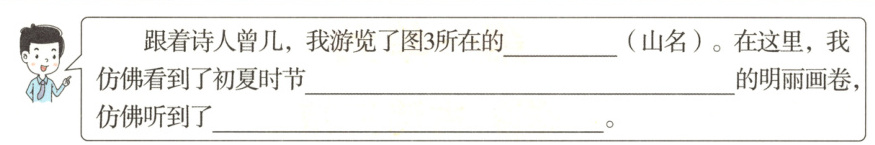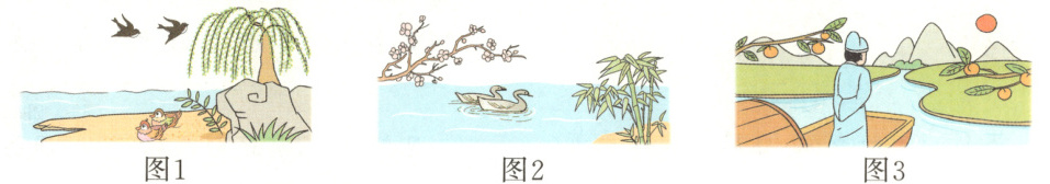 解析:本题考查对古诗内容的掌握。先根据图片内容判断诗句,再正确填写。图1中,燕子在空中飞,鸳鸯卧在岸边沙子里,与燕子和鸳鸯相关的诗句是“泥融飞燕子,沙暖睡鸳鸯”,根据提示填出所缺部分即可。图2有桃花、竹子、鸭子、水,据此可知诗句应该是《惠崇春江晚景》中的“竹外桃花三两枝,春江水暖鸭先知”。图3中,有人乘船顺水而行,两侧有两棵树,树上的梅子泛黄,显然已经成熟了,远处有山,可知诗句应该是《三衢道中》的“梅子黄时日日晴,小溪泛尽却山行”。