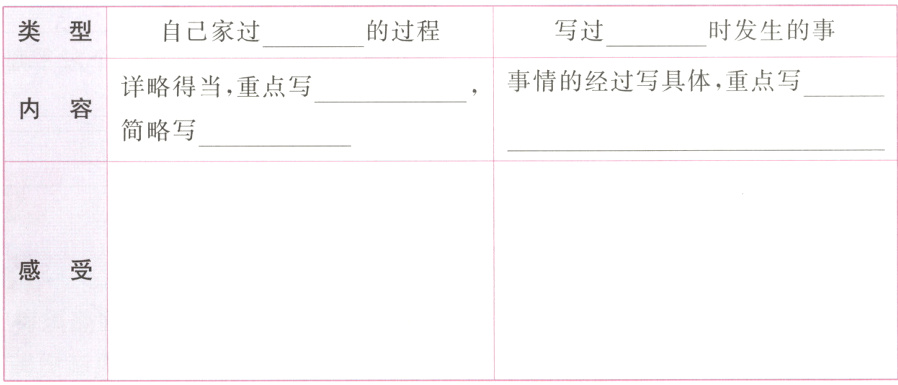 1. 【会审题】本次习作的关键词是__________,围绕关键词,我们可以写自己家________的过程,也可以写节日中________________________的事。