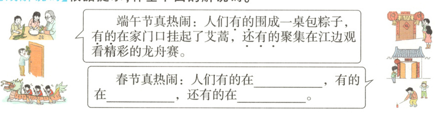 解析:本题考查仿写句子的能力。例句用先总后分的写法介绍了热闹的端午节里人们的不同活动。按照题目要求,围绕“春节真热闹”写出春节时人们不同的三种活动即可。