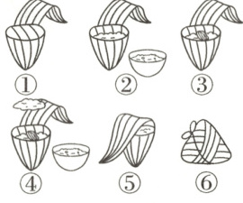 示例:包粽子时,要先拿起一片粽叶,把它卷成一个锥体,再填入一半糯米,接着放几颗红枣,然后用糯米把锥体填满,最后把多余的叶子盖下来,用红线捆上就可以了。