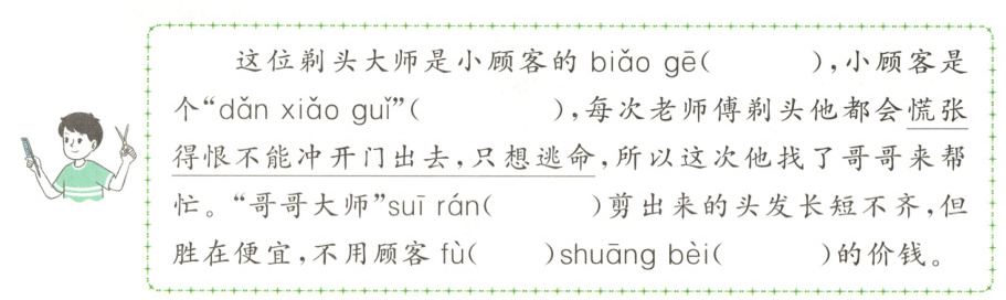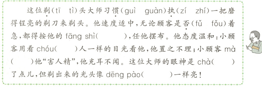 “害人精”原意是______________________,联系上下文,小沙在剃头时吃尽苦头,可最后还要付双倍的钱,小沙很生气,所以称______________为“害人精”,体现出小沙__________________________之情。