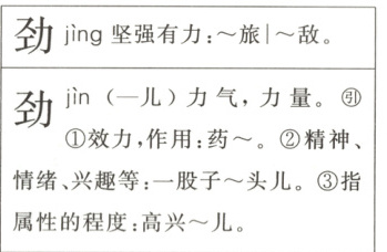 解析:本题考查多音字。“劲”在“劲风”“疾风知劲草”中是“坚强有力”的意思,应读jìng;在“起劲儿”中表示“精神、情绪、兴趣等”,在“没劲儿”中指“力气,力量”,都读jìn。