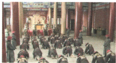 。一个个序齿排班,朝上礼拜,都称“千岁大王”。结合右侧影视剧中的图片可知,“拱伏无违”的意思是