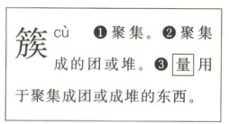 3. (唐山真题)导游词中的“簇”字用音序查字法查字典,应先查大写字母______,再查音节______;用部首查字法查字典,应查部首______,再查______画。“簇”在字典里的解释