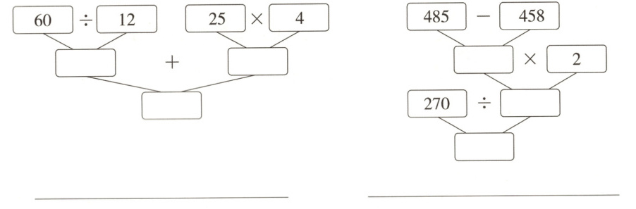 5 100 105 $60\div12 + 25\times4 = 105$ 27 54 5 $270\div[(485 - 458)\times2]=5$