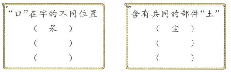 2. 汉字真奇妙,标语中“品”的部件“口”在字的不同位置会变成哪些字?有哪些字含有共同的部件“土”?根据提示填一填。