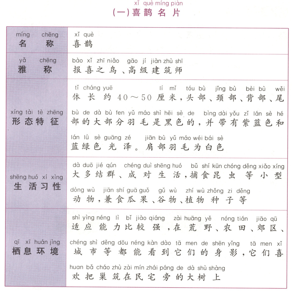 @@示例:喜鹊是报喜之鸟。解析:本题考查联结运用的能力。名片中提到喜鹊被称为“报喜之鸟”。联系生活实际我们也可以知道,在中国,喜鹊是吉祥的象征。据此回答即可。