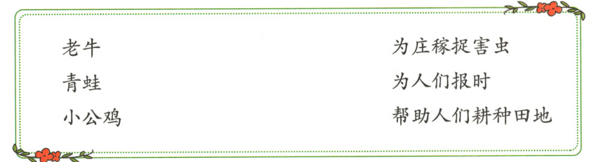 4. 老牛——帮助人们耕种田地 青蛙——为庄稼捉害虫 小公鸡——为人们报时