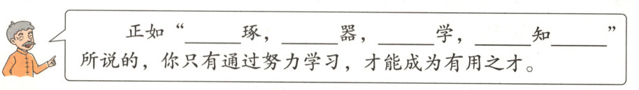 解析:本题考查课文的背诵和理解。根据题目提示填空。“玉不琢,不成器,人不学,不知义”意思是“玉不打磨雕刻,不会成为精美的器物,人若是不学习,就不懂得礼仪,不能成才”。