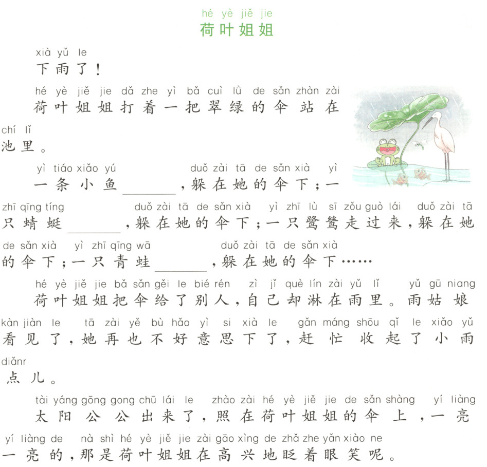 解析:本题考查提取信息的能力。根据“一条小鱼游过来……一只青蛙蹦过来,躲在她的伞下”可知,小鱼、蜻蜓、鹭鸶、青蛙躲在荷叶姐姐的伞下。故答案应选②③⑤。