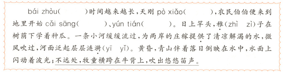 (1)从“未解”“学”等字词可以想象到儿童学种瓜时生疏、笨拙的动作,从中可以体会到农村孩子的______________以及______________的品格,表达了诗人对儿童的__________之情。