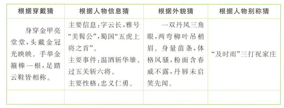 3.(温州真题)在阅读古典名著的过程中,同学们认识了很多个性鲜明的人物。根据下列线索猜出对应的人物,补充表格。