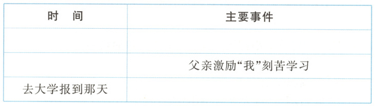 1.上初中时 父亲要“我”大雪天自己骑车去上学 考大学前 父亲让“我”只身去异乡上学解析:本题考查概括文章内容的能力。本文按照时间顺序描写了三件事:上初中时,父亲让“我”雪天骑车上学;考大学前,父亲激励“我”刻苦学习;大学报道时,父亲让“我”自己去异乡上学。据此填写即可。2.吃苦 惰性 越长越强解析:本题考查对文章内容的理解。联系文章内容可知,父亲认为孩子不能娇生惯养,要从小吃苦。孩子会有惰性,需要不断激励,这样才能像草一样越长越强。据此填写即可。3.示例:作者借用恶劣的环境描写,表现父亲的“狠心”,深化了文章主题。解析:本题考查对句子的分析。文章中第2自然段画横线的句子运用了环境描写。这样的描写写出了当时天气的恶劣,更突出了父亲的“狠心”,深化了文章主题。答题模板:判断句子运用的描写方法(环境描写/细节描写等)+结合文章内容,体会表达效果(写出了……,突出了……,深化了……)。4.示例:运用了语言描写,刻画了一个用极为传统、简朴的语言鼓励、鞭策作者自立自强的父亲形象。解析:本题考查对文章内容的理解。“去大学报到那天”这个事例中,作者主要抓住父亲的语言描写,突出了父亲对作者的鼓励以及对作者自立自强的期许。