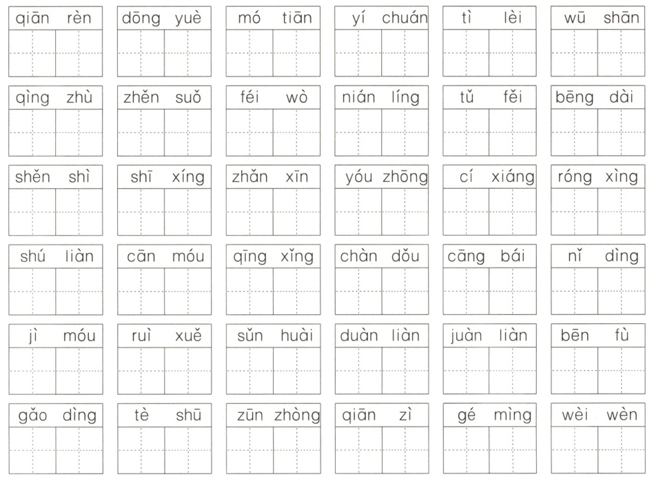 千仞 东岳 摩天 遗传 涕泪 巫山 庆祝 诊所 肥沃 年龄 土匪 绷带 审视 施行 崭新 由衷 慈祥 荣幸 熟练 参谋 清醒 颤抖 苍白 拟定 计谋 瑞雪 损坏 锻炼 眷恋 奔赴 搞定 特殊 尊重 签字 革命 慰问