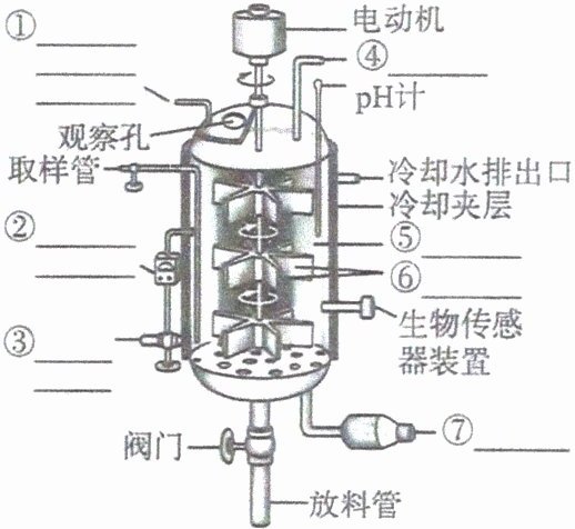 4. ①培养物或营养物质的加入口 ②温度传感器和控制装置 ③冷却水进入口 ④排气管 ⑤发酵液 ⑥搅拌叶轮 ⑦空气入口