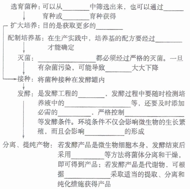 3. 自然界;诱变;基因工程;菌种;反复试验;培养基和发酵设备;产量;中心环节;微生物数量、产物浓度;营养成分;温度、pH和溶解氧;微生物代谢物;过滤、沉淀;产物的性质