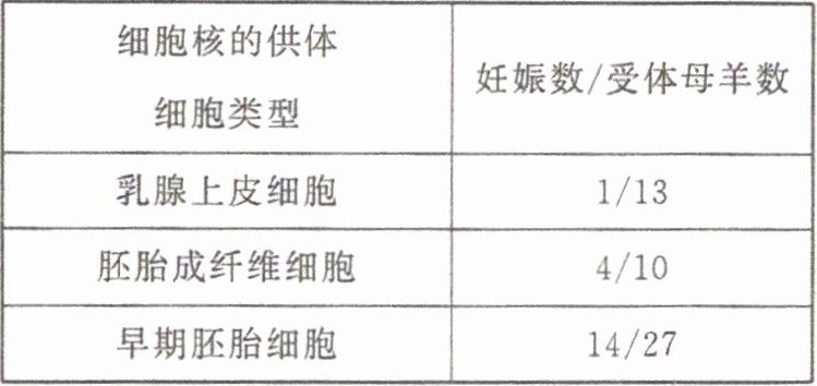2. 科学家培育克隆羊时,使用了三种细胞核的供体细胞,分别将这些细胞核移入去核卵母细胞的细胞质中,形成重组细胞,发育成重构胚,这些重构胚的发育情况如下: