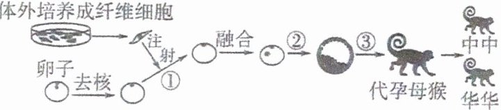 5. 中国科学院研究团队对雌性猕猴进行克隆,成功获得“中中”和“华华”两姐妹,突破了现有技术无法体细胞克隆非人灵长类动物的世界难题,为建立人类疾病的动物模型、研究疾病机理、研发诊治药物带来光明前景。下图为“中中”和“华华”培育的流程,相关叙述不正确的是(