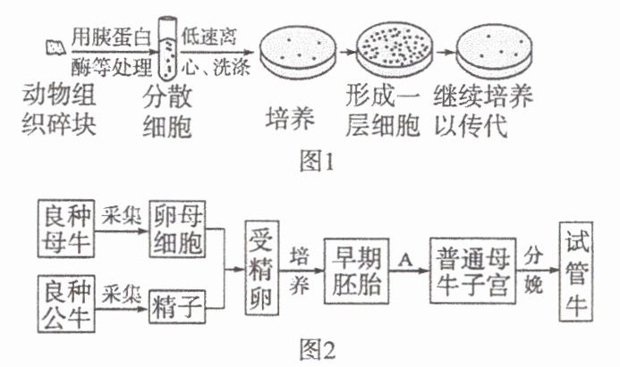4. 图1是从动物体内获得相关组织,分散成单个细胞后,模拟体内环境,使其继续生长、增殖的技术过程图解,图2是利用胚胎工程培育“试管牛”的基本过程图解。请据图回答问题: