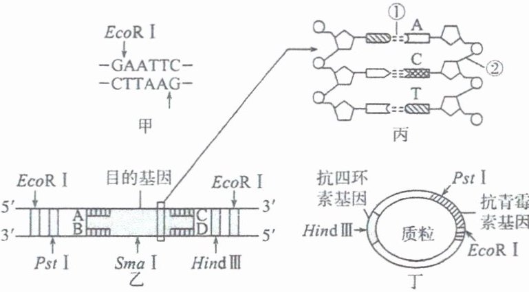 1. 基因表达载体的构建是基因工程的核心。图甲表示限制酶EcoRⅠ的识别序列;图乙表示目的基因及限制酶切点,A、B、C、D为四种引物;图丙表示目的基因上的DNA片段;图丁表示质粒。下列相关叙述错误的是(