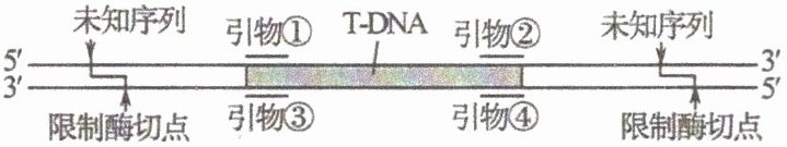 2. 农杆菌Ti质粒上的T - DNA可以转移并随机插入被侵染植物的染色体DNA中。研究者将下图中被侵染植物的DNA片段连接成环,并以此环为模板进行PCR,扩增出T - DNA插入位置两侧的未知序列,以此可确定T - DNA插入的具体位置。下列相关叙述错误的是(
