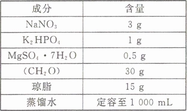 D 解析:该培养基配方中有凝固剂琼脂,依物理性质划分,应属于固体培养基,A正确;NaNO₃含有氮元素,可作为氮源,B正确;该培养基中的(CH₂O)可作为有机碳源,因此其培养的微生物是同化作用类型为异养型的微生物,C正确;液体培养基中加入凝固剂(如琼脂)可形成固体培养基,固体培养基中去除凝固剂才能制成液体培养基,D错误。