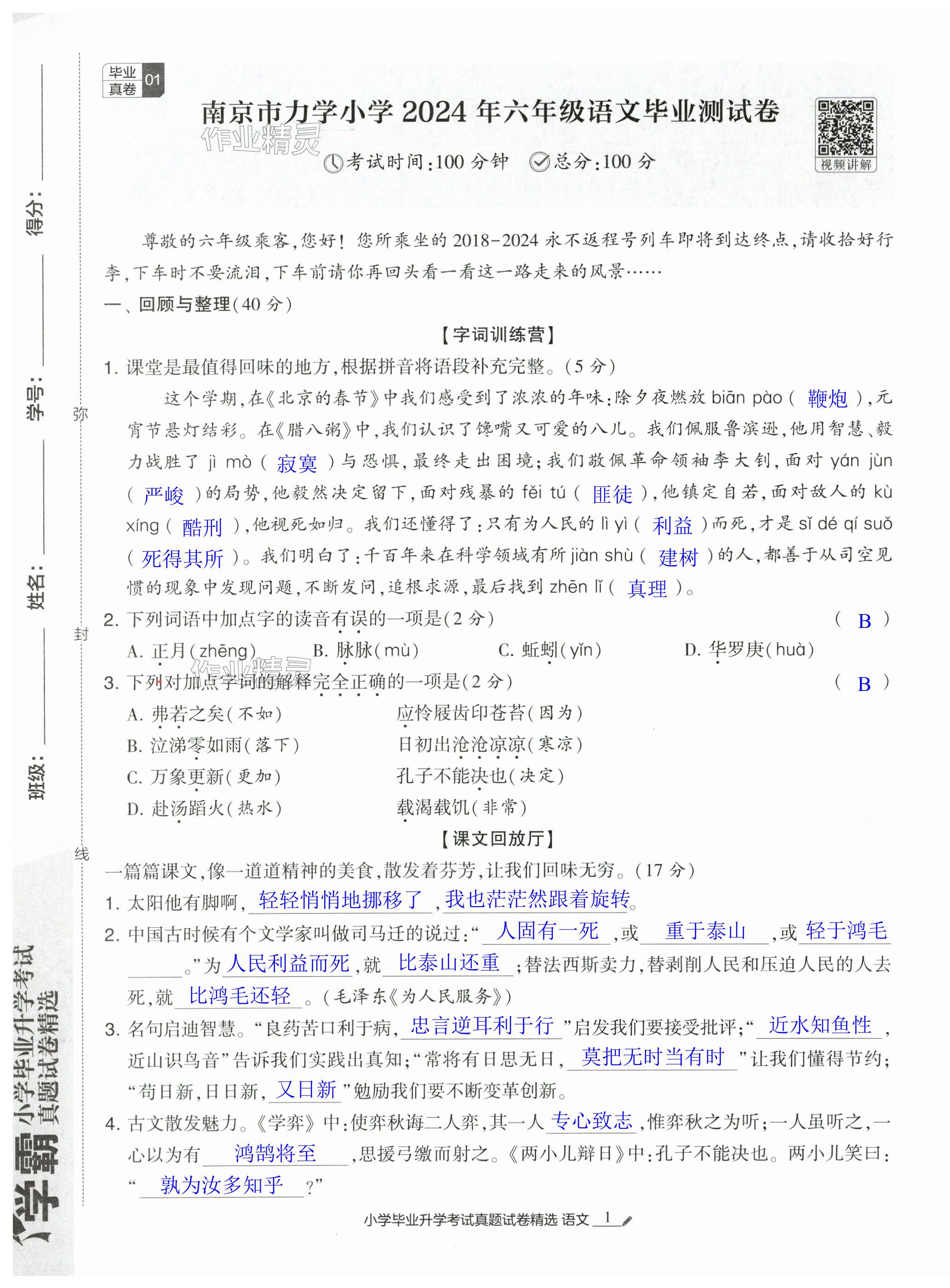 2025年经纶学典小学毕业升学考试真题试卷精选六年级语文人教版江苏专版