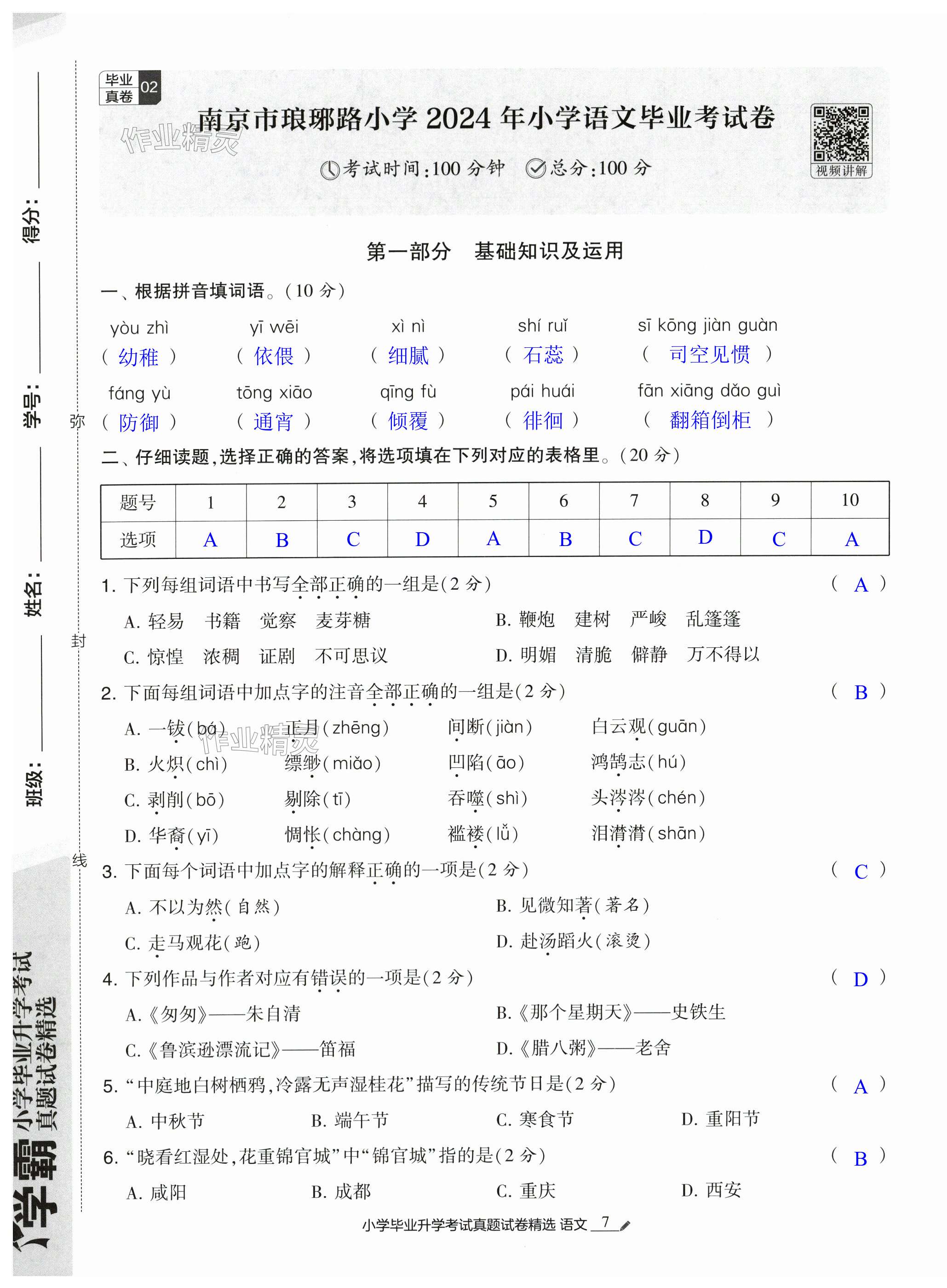 注:目前有些书本章节名称可能整理的还不是很完善,但都是按照顺序排列的,请同学们按照顺序仔细查找。练习册 2025年经纶学典小学毕业升学考试真题试卷精选六年级语文人教版江苏专版 答案主要是用来给同学们做完题方便对答案用的,请勿直接抄袭。