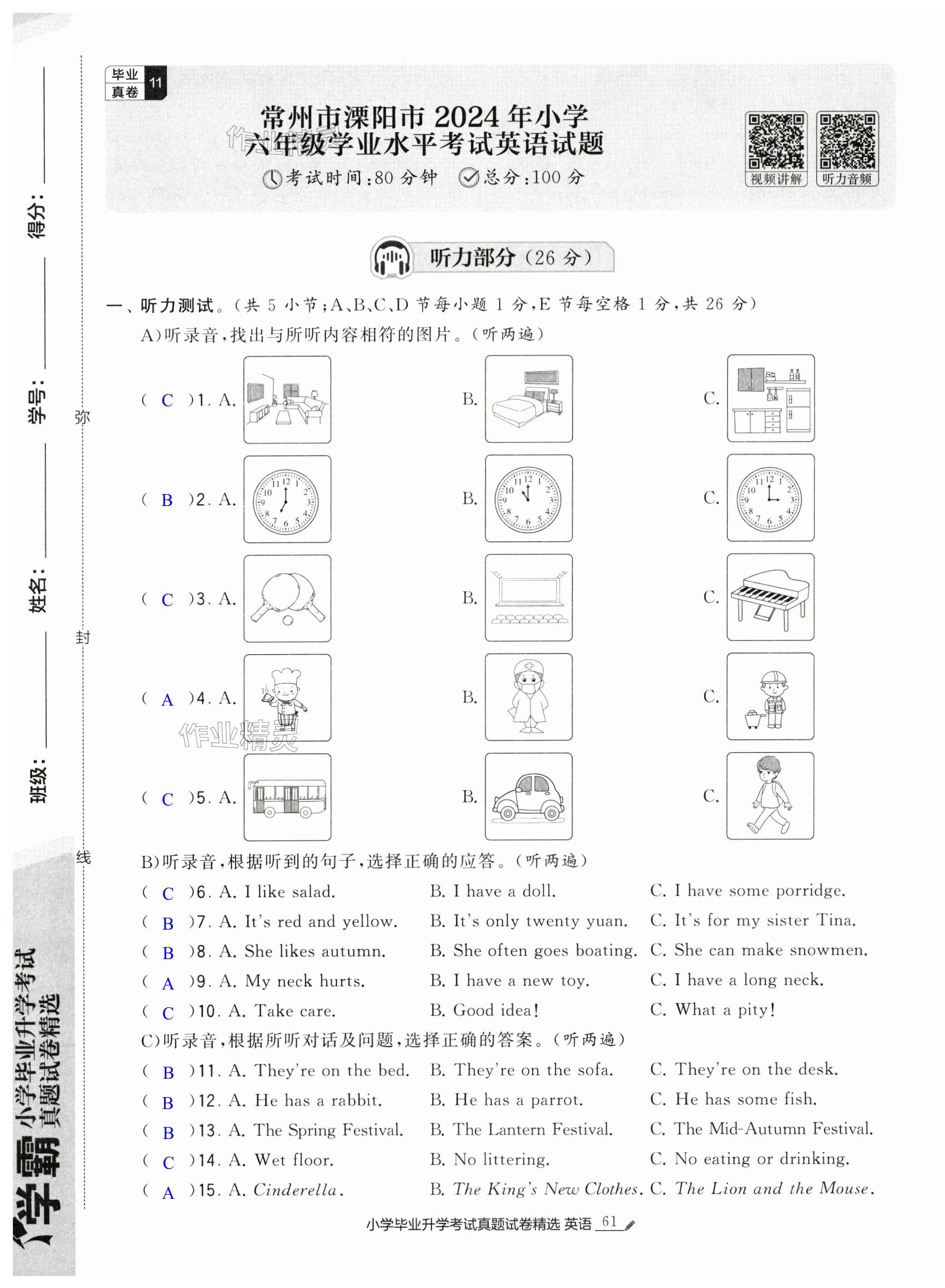 注:目前有些书本章节名称可能整理的还不是很完善,但都是按照顺序排列的,请同学们按照顺序仔细查找。练习册 2025年经纶学典小学毕业升学考试真题试卷精选英语江苏专版 答案主要是用来给同学们做完题方便对答案用的,请勿直接抄袭。