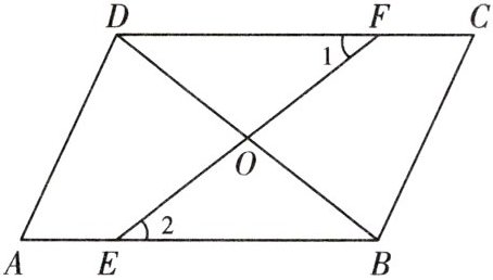 在△DOF 和△BOE 中,$\begin{cases} \angle1 = \angle2 \\ \angle DOF = \angle BOE \\ OD = OB \end{cases}$