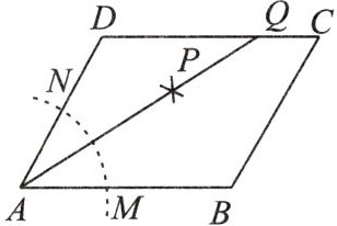 9. 如图,在平行四边形ABCD中,按以下步骤作图:①以A为圆心,任意长为半径作弧,分别交AB、AD于点M、N;②分别以M、N为圆心,以大于$\frac{1}{2}$MN的长为半径作弧,两弧相交于点P;③作射线AP,交边CD于点Q,若DQ = 2QC,BC = 3,则平行四边形ABCD周长为________.