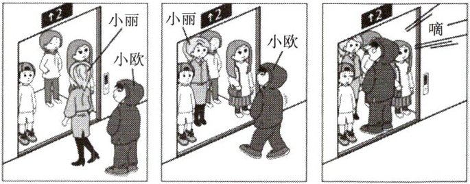 4. 如图为小丽和小欧依序进入电梯时,电梯因超重而警示音响起的过程,且过程中没有其他人进出.