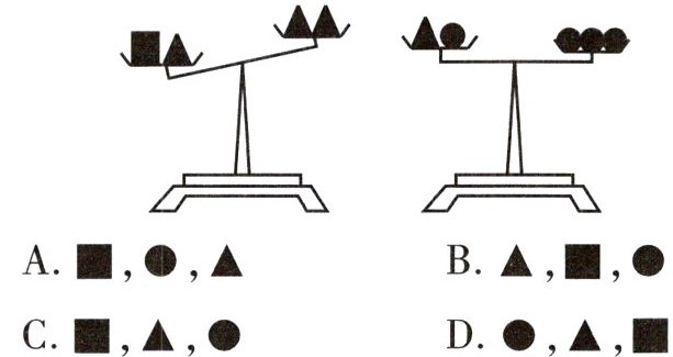 5. 设“▲”“●”“■”分别表示三种不同的物体,现用天平称两次,情况如图所示,那么▲,●,■这三种物体按质量从大到小排列应为 ( )