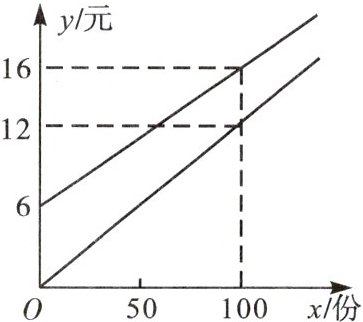 当 $y_{甲}=y_{乙}$ 时,$0.1x + 6 = 0.12x$,得 $x = 300$;