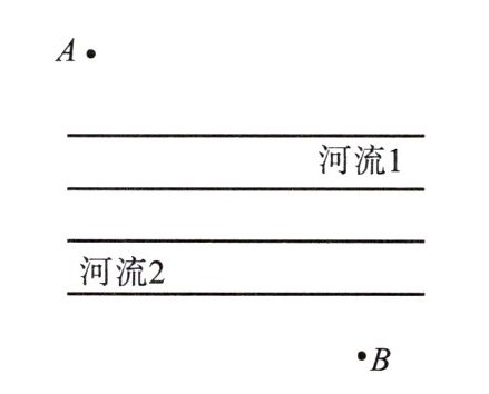 方法 1:如图 1,将点 A 沿与第一条河流垂直的方向平移一个河宽到 A₁,将 B 沿与第二条河垂直的方向平移一个河宽到 B₁,连接 A₁B₁与两条河分别相交于 P、M,在 P、M 两处,分别建桥 PQ、MN,所得路径 AQPMNB 最短.