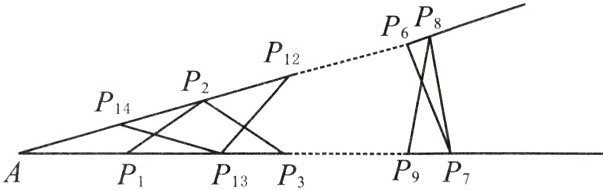 14. 如图钢架中,焊上等长的13根钢条来加固钢架,若AP₁ = P₁P₂ = P₂P₃ = … = P₁₃P₁₄ = P₁₄A,求∠A的度数.