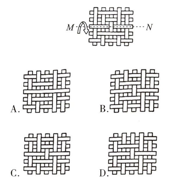 1. 一块竹条编织物,先将其按如图所示绕直线MN翻转180°,再将它按逆时针方向旋转90°,所得的竹条编织物是 ( )