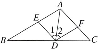 9. 如图,D是△ABC的边BC上一点,DE//AC交AB于点E,DF//AB交AC于点F,连结DA,若∠1 = ∠2,试说明AD是△ABC的角平分线.
