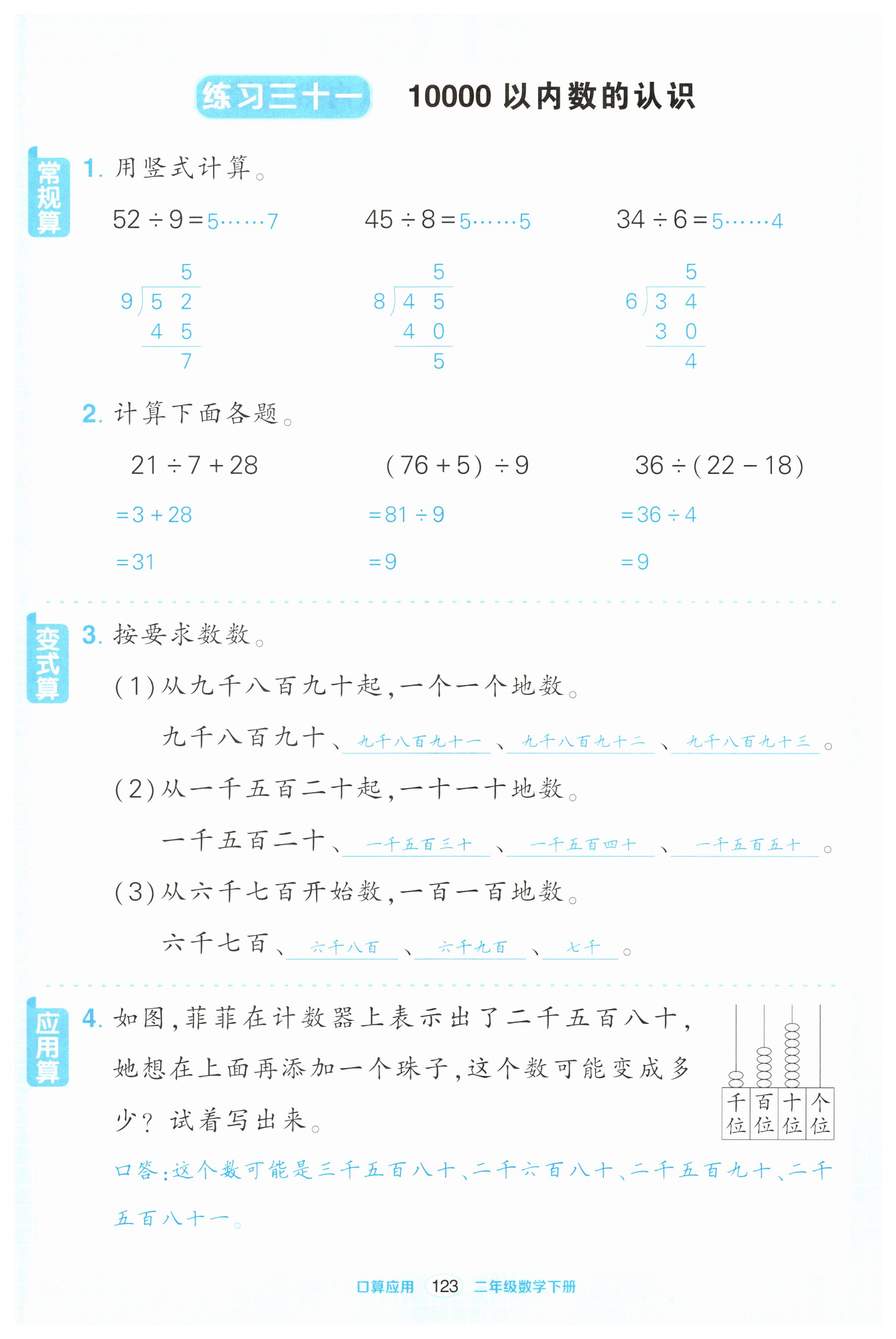 注:目前有些书本章节名称可能整理的还不是很完善,但都是按照顺序排列的,请同学们按照顺序仔细查找。练习册 2025年黄冈状元成才路状元作业本二年级数学下册人教版福建专版 答案主要是用来给同学们做完题方便对答案用的,请勿直接抄袭。