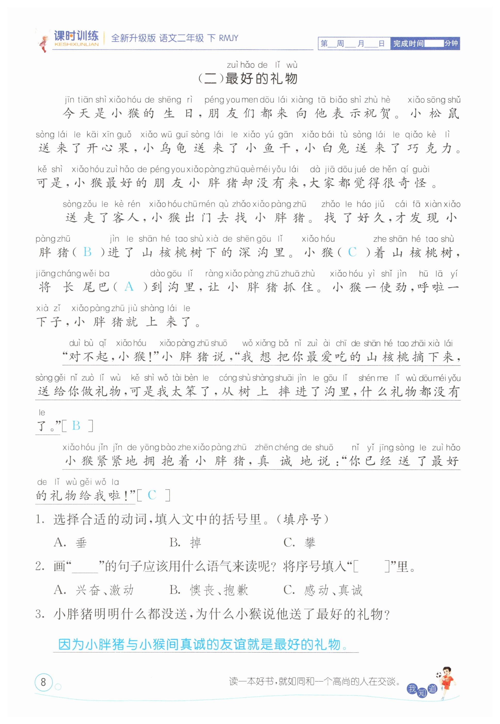 注:目前有些书本章节名称可能整理的还不是很完善,但都是按照顺序排列的,请同学们按照顺序仔细查找。练习册 2025年课时训练江苏人民出版社二年级语文下册人教版 答案主要是用来给同学们做完题方便对答案用的,请勿直接抄袭。