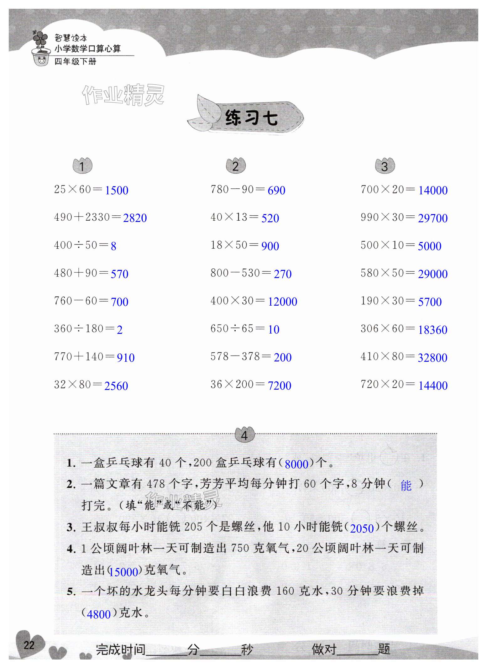 注:目前有些书本章节名称可能整理的还不是很完善,但都是按照顺序排列的,请同学们按照顺序仔细查找。练习册 2025年智慧读本小学数学口算心算四年级下册苏教版 答案主要是用来给同学们做完题方便对答案用的,请勿直接抄袭。