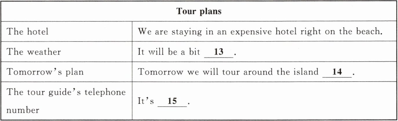 | Tomorrow's plan | Tomorrow we will tour around the island 14 . |