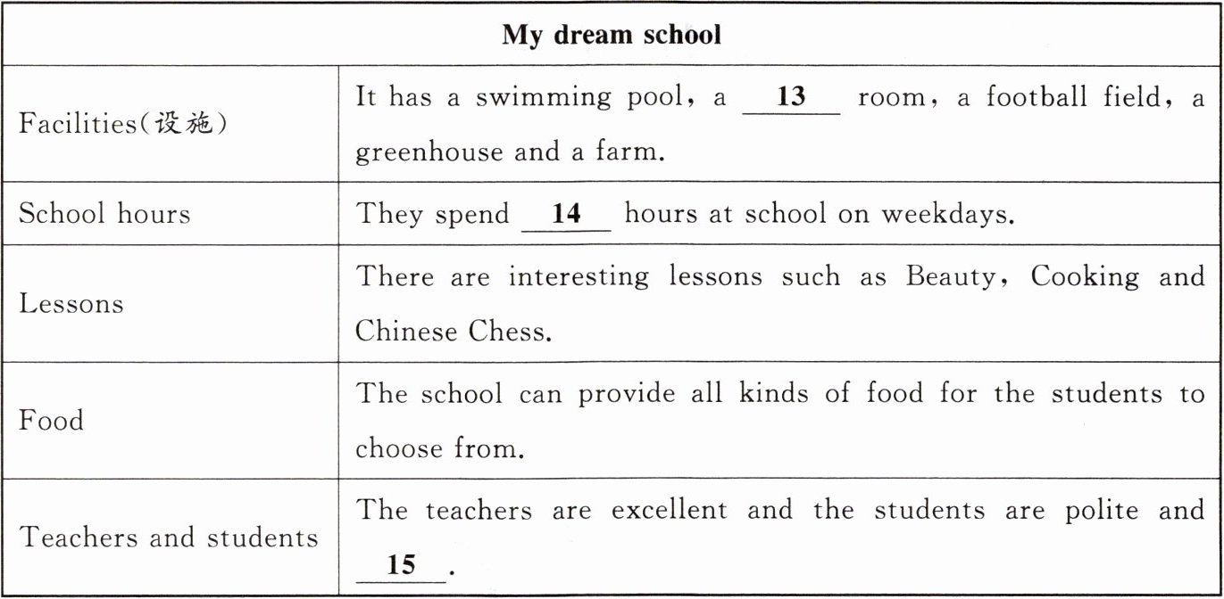 | Facilities(设施) | It has a swimming pool,a 13 room,a football field,a greenhouse and a farm. |