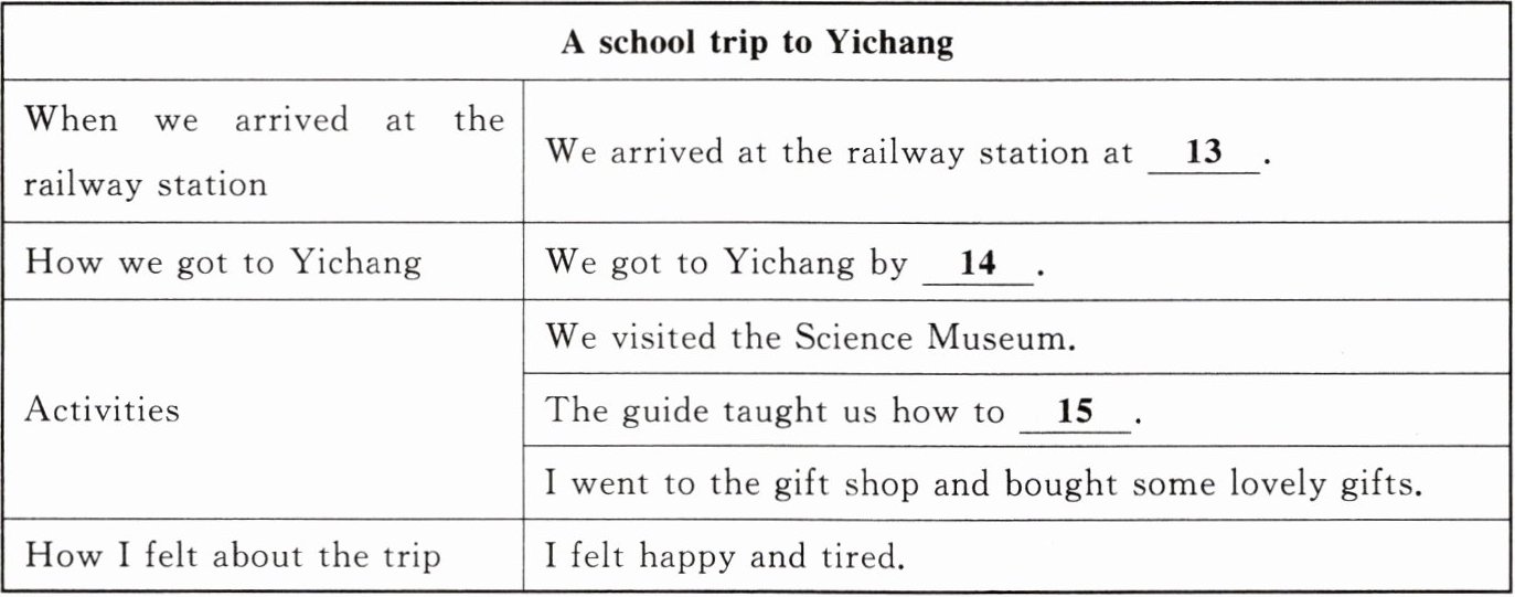 | Activities | We visited the Science Museum.The guide taught us how to 15 .I went to the gift shop and bought some lovely gifts. |