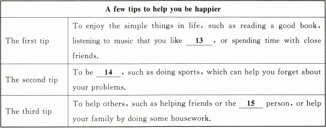 | The first tip | To enjoy the simple things in life, such as reading a good book, listening to music that you like 13 , or spending time with close friends. |