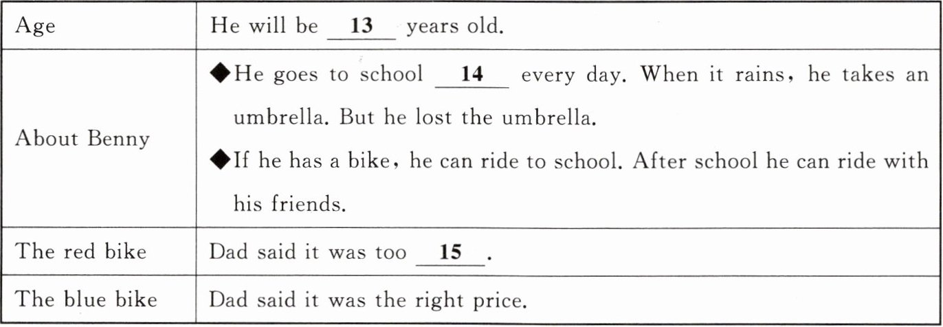 | About Benny | ◆He goes to school 14 every day. When it rains, he takes an umbrella. But he lost the umbrella.◆If he has a bike, he can ride to school. After school he can ride with his friends. |