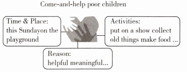 In the activity we plan to do three things on that day. First, we plan to put on a show, because it can spread love. Second, we’d like to make some Chinese food for sale, and we will cook fried rice and make dumplings. They are popular and easy to cook. Finally, we will collect some old books and toys to the children in need. It must be quite helpful and meaningful.