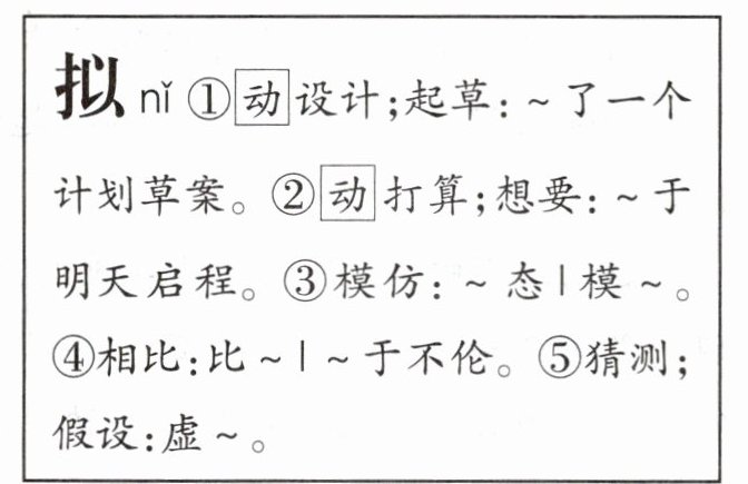 (2)[语言运用.词典运用]小唐同学认为“班史拟取名为‘奔跑’”中的“拟”字应去掉。请参照下图,说说你的看法。